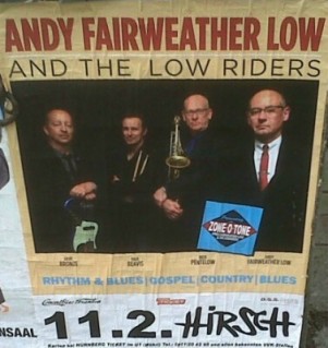Molti di noi hanno giá visto sul palco Andy Fairweather-Low suonare con Roger Waters o forse con Eric Clapton. Poter vederlo dal vivo con il suo gruppo, i Low Riders, é decisamente tutta un'altra cosa! Un grande artista che stimo tantissimo, uno che continua la sua carriera veramente prestigiosa iniziata negli anni 60 con gli indimenticabili Amen Corner,poi la sua carriera solista e parallelamente quella di session man (The Who, Roy Wood, Joe Satriani, George Harrison, perfino Kate Bush e naturalmente Clapton e Waters...e la lista é molto incompleta!). Ricordiamo che Fairweather-Low inizió a collaborare con Roger Waters nel 1985 durante il tour americano di The Pros and Cons of Hitch-Hiking ed ha continuato con lui fino al 2007. Le 8 date tedesche di Andy Fairweather-Low con i suoi Low Riders sono state probabilmente non sufficienti ad accogliere tutti i suoi fans! Al suo concerto del giorno 11 febbraio, proprio nel bel mezzo della settimana, il pubblico é accorso da ogni parte, a quanto ho potuto sentire, per non mancare a questo appuntamento.Un tour con i Low Riders che é servito anche a promuovere l'attuale CD "Zone-O-Tone" pubblicato nel 2013 ( Proper RecordsPRPCD110 ) e con la partecipazione di Paul Carrack ma anche altri CD pubblicati negli ultimi anni dallo stesso Fairweather-Low. E se ascoltare i suoi CD é un vero piacere, assistere ad un suo concerto é cento volte meglio. Puntuali sul palco, Andy con la sua immancabile chitarra , Paul Beavis (batteria), Nick Pentelow (sassofoni e clarinetto) , Dave Bronze (basso) e una bella bandiera del Galles! Un alternarsi di versioni cover e brani suoi tra cui La Booga Rooga, La La Music, When Things Go Wrong, Bend Me Shape Me, Peter Gunn, Hymn 4 My Soul, Slowly, (If Paradise is) Half As Nice, Tequila... Una vera leggenda della musica britannica che va sul palco non tanto per mostrare le sue indiscusse e grosse abilitá tecniche ma che preferisce lasciare il ruolo di protagonista ai brani che lui e il suo gruppo propongono al pubblico. Giulia Di Nardo-Spies |