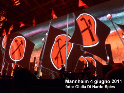 Sabato 4 giugno 2011. Roger Waters ha rappresentato il suo secondo concerto a Mannheim. Ascolto diverse persone che erano presenti anche il giorno prima , mai visto qualcosa di simile, dicono tutte! Ognuno racconta le sue esperienze, c'é perfino chi dice di essere stato cosí "sfortunato" di essere partito per vedere il concerto dell' 11 maggio a Londra e non il giorno dopo! I fans accorrono da ogni angolo della terra, ma tra tutti mi ha colpita piacevolmente una grande ammiratrice di Waters venuta dal Brasile. Peccato che proprio i grandi amici italiani non siano qui, mi viene un momento di nostalgia! Non credo ai miei occhi di essere riuscita a mantenere questo grande appuntamento, i biglietti per tutta la famiglia attendevano da un anno! La giornata é piovosa ma calda, attendiamo giá in molti di vivere il grande show. Finalmente, intorno alle ore 15 , abbiamo la possibilitá di ascoltare il soundcheck, breve, forse perché nella stessa Arena avevano suonato giá il giorno prima. Mi accingo a comprare un tour programme e mi incanto a guardare la grossa scelta di t-shirt, peró alla fine non cedo...Gli ultimi scambi di opinione tra fans e poi gli ultimi minuti che non passano mai! Finalmente si puó andare a cercare il posto. In sala, prima del concerto, ci fanno ascoltiano brani di Dylan, Lennon...Waters non cambierá mai i suoi gusti musicali. Con pochi minuti di ritardo inizia il concerto, o meglio dire, il grande spettacolo. Incredibile, é uno show cosí grande ma Waters sembra che stia dando un concerto per pochi amici. Molto rilassato e a suo agio, riesce perfettamente a trasmettere al pubblico tutto quello di cui aveva da dire.Waters prova anche con successo a dire un paio di frasi in tedesco e ricorda anche dei suoi vecchi concerti in Germania relativi allo stesso album. Anche se The Wall é quasi suonato cosí come lo si conosce, il resto dei musicisti sembra svanire dietro le scene gigantesche e ultra moderne rispetto all'originale The Wall Tour. Non credo che sia solo la mancanza di un virtuoso della chitarra come Gilmour a far perdere peso agli altri componenti del gruppo ma é principalmente la forza dell'interpretazione di Waters . Veramente niente male gli altri vocalisti, Wyckoff , Joyce e i Lennon! Per chi non ha potuto assistere ad almeno un concerto dico che é stato un vero peccato, purtroppo la grandiositá di questo spettacolo é impossibile da descrivere. Con la pubblicazione di un DVD, magari il concerto intero del 12 maggio, potremo tutti ricordare questo storico ed ineguagliabile tour. Giulia Di Nardo-Spies |